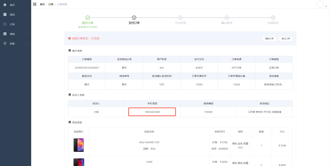 再次访问首页->订单->订单详情页面,现在这个页面的手机号码就不再是明文显示,而是加密之后的状态。
