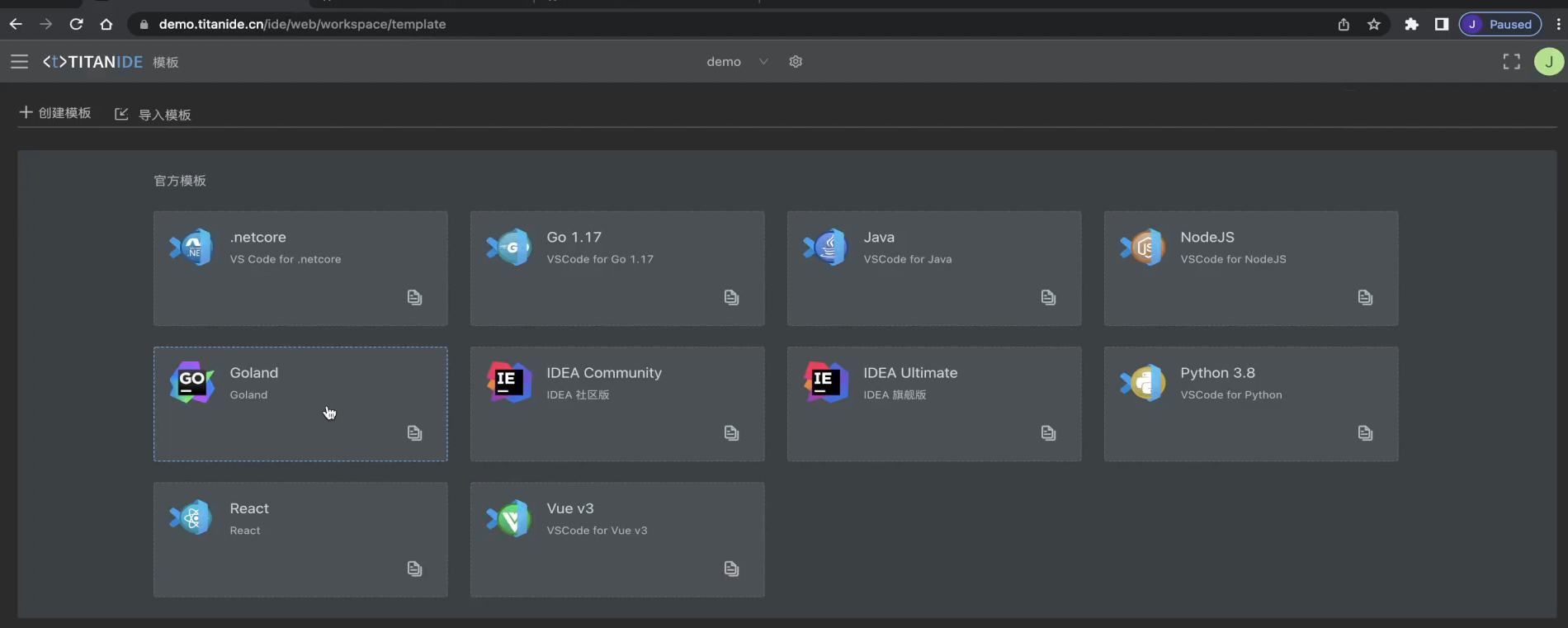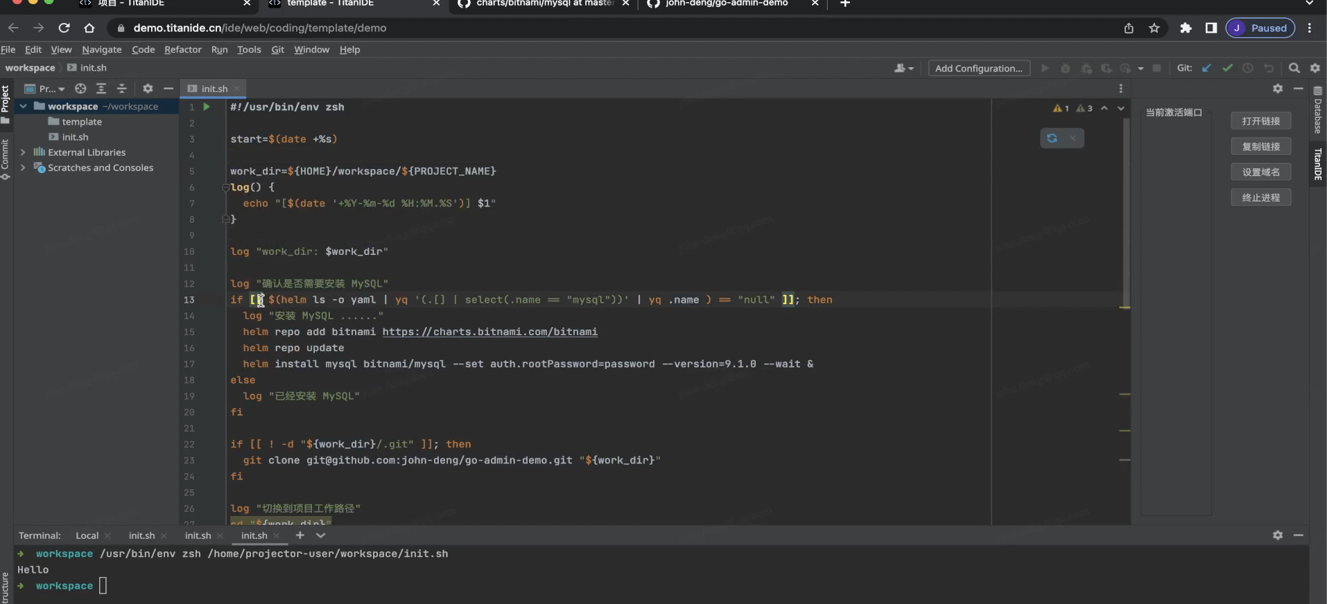 我们来复制一个 Gloand 基础模板到我的工作空间,我们就叫 Go Admin,然后编辑这个 Go Admin 模板,添加一个脚本块,粘贴刚才调试好的脚本并保存,一个 [TitanIDE] 深度定制模板新鲜出炉了,快分享给您的团队小伙伴来体验吧!
